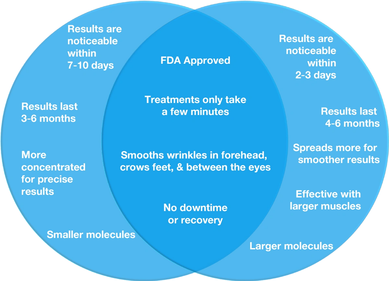 Dysport® and Botox® are both considered to be a minimally invasive and safe treatments. Very few patients experience side effects. The most common side effects are nose and throat irritation, headache, injection site pain, injection site skin reaction, upper respiratory tract infection, eyelid swelling, eyelid drooping, sinus inflammation, and nausea.